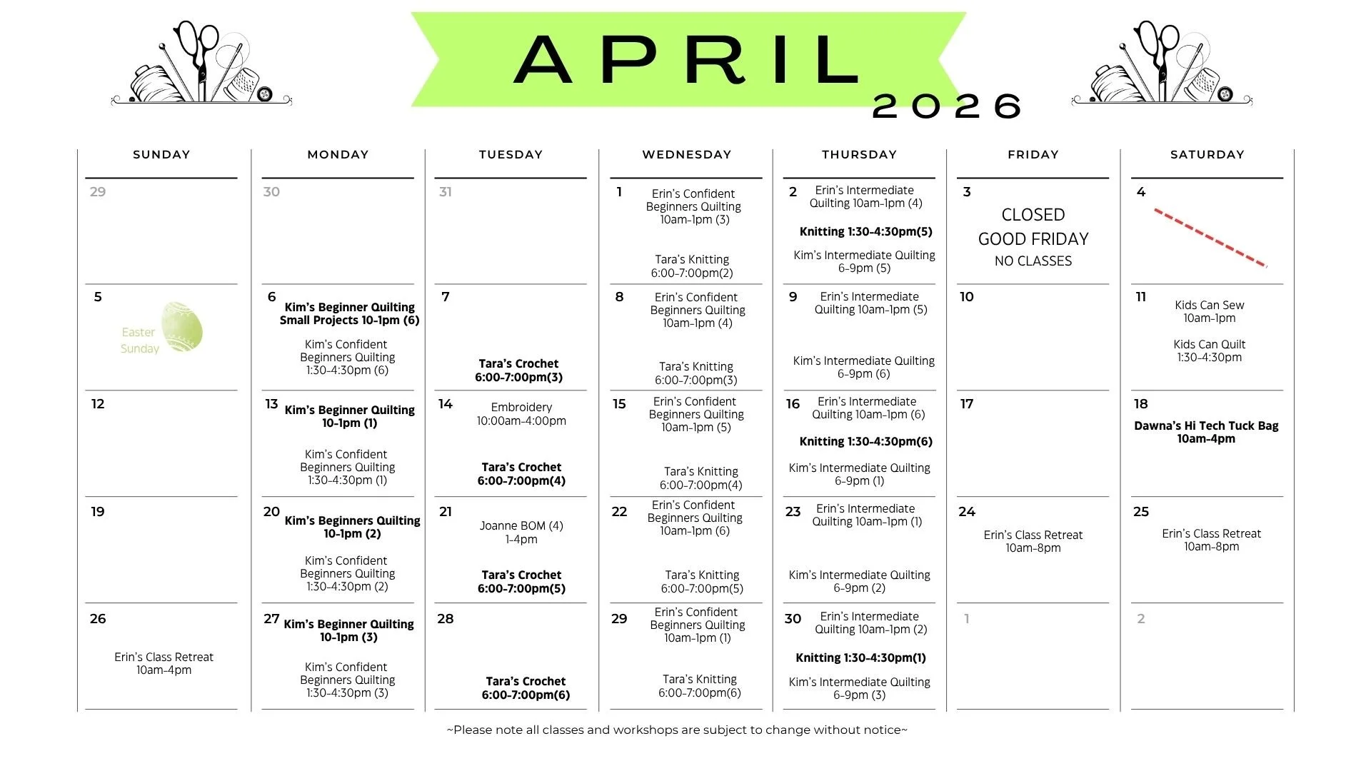 All Algonquin Sewing Center Classes & Workshops are subject to change without notice.